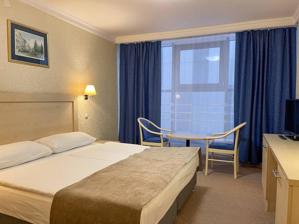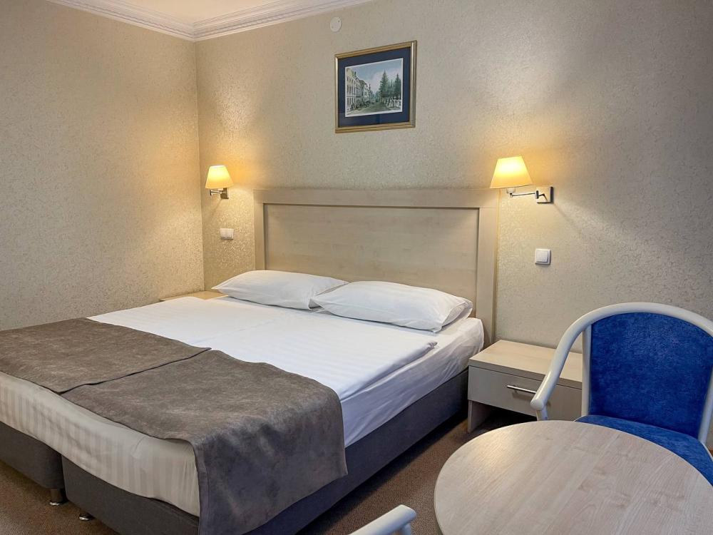 Уютный и светлый номер, оформленный в современном эко-стиле. Большие панорамные окна открывают вид на сосновый бор и создают атмосферу полного отдыха. В комнате — две комфортные кровати с ортопедическими матрасами, зона отдыха с мягкими креслами, рабочий стол для ноутбука и вместительный шкаф.